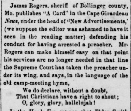 “James Rogers, sheriff of Bollinger county, Mo. publishes “A Card” in the Cape Girardeau News, under the head of “New Advertisements,’ (we suppose the editor was ashamed to have it seen in this reading matter) defending his conduct for having arrested a preacher. Mr Rogers can make himself easy on that point his services are no longer needed in that line