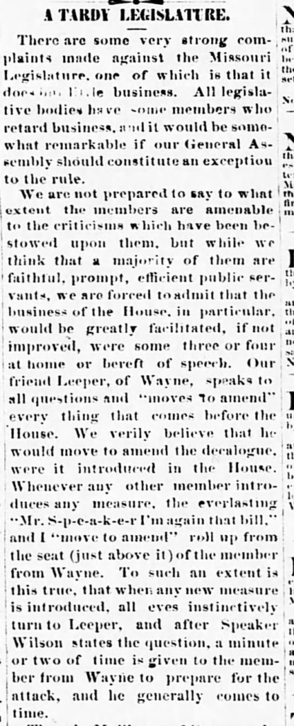 Another , more humorous account of William T. Leeper’s gaffs , or Leeperisms (as I call them) can be found in the Wednesday February 28, 1872 , Lexington Intelligencer newspaper (which also shows how others viewed him), when Leeper was a Missouri State Representative.