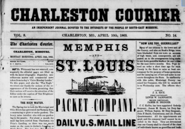 “Many of our citizens in the lower end of the County and also on Rush’s Ridge have been blockaded from our town on account of high water, and consequently, are not posted as to the arrangements being made to put down guerrilla warfare in our area for the next twelve months. Gen. Pope issued an order a short time ago for each County in the State to raise at least one company for the purpose of home protection and the carrying out of law and order in our courts throughout the State. In conformity with this order, Mississippi County has raised her Company, who will be mustered on Wednesday next.”