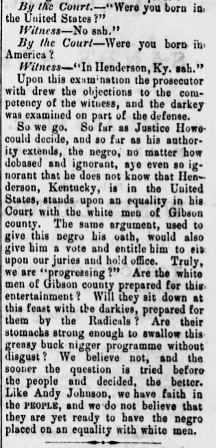My response to these types of accusations is to take a look at how former slaves were treated in the post-war North. The May 18, 1866 edition of Charleston Courier (Mississippi County, Missouri) carries an article originally published in the Princeton (Indiana) Democrat newspaper, which carried the headline “A Henderson County Nigger on the Witness Stand” The article needs no explanation.