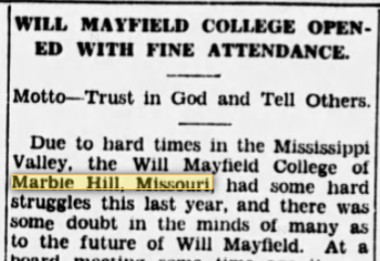 On the September 13, 1929 the Republic Tribune (Union, Missouri) carried a lengthy article about the Will Mayfield College stating that: