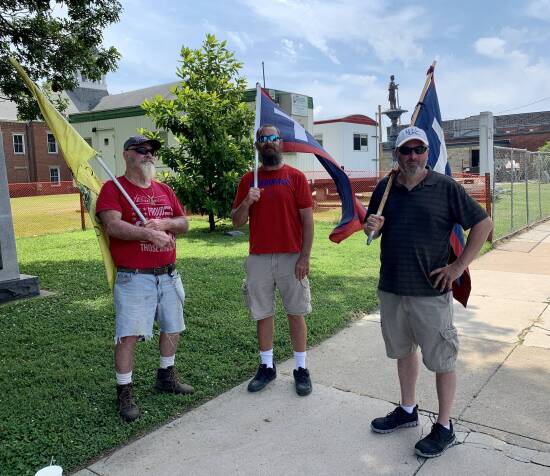 “From left: Steven Thrasher of Cottonwood Point, Missouri; Rodney Neville of Cooter, Missouri; and Clint Lacy of Marble Hill, Missouri, protest the potential removal of the Confederate monument from Ivers Square in Cape Girardeau on Sunday. “We’re protesting the removal of American history; it’s no longer just about the Confederacy” said Neville. Lacy added: “If they do move it to Old Lorimier Cemetery, I understand that visits are by appointment only. I hope they open the cemetery during the day, and they don’t place a plaque on it. We know what the monument represents; it doesn’t need an explanation.” Lacy said the group, which promoted the gathering on Facebook, had been protesting daily since Friday and that the most present at any one time was five people. The monument is the white slab over Lacy’s left shoulder. The ground around it is closed because of construction on nearby buildings. Two prominent local historic preservation groups, the city’s Historic Preservation Commission and the Kellerman Foundation, have recommended the monument be moved.”