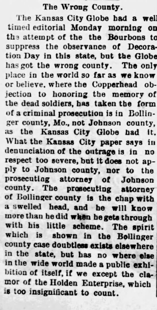“The only place in the world so far as we know or believe , where the Copperhead objection to honoring the memory of dead soldiers, has taken the form of a criminal prosecution is in Bollinger County, Missouri.”