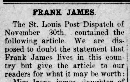 “The St. Louis Post-Dispatch of November 30th, contained the following article. We are disposed to doubt the statement that Frank James lives in this country but give the article to our readers for what it may be worth.”