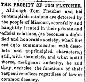 “Although Tom Fletcher and his contemptible minions are detested are detested by the people of Missouri, scornfully and haughtily treated in their private and official relations ( as becomes a dignified and honorable society , when forced into communication with dissolute and unprincipled characters, ) still with shameless and what is still worse malignant audacity, he and they , exercise the functions of their respected offices regardless of law or common decency.