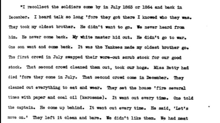 “I recollect the soldiers come by in July, 1863 or 1864 and back in December. I heard talk so long ‘fore they got there , I knowed who they was. They took my oldest brother. He didn’t want to go. We never heard from him. He never came back. My white master hid out. He didn’t go to war. One son went and came back. It was the Yankees made my oldest brother go. The first crowd in July swapped their wore-out scrub stock for our good stock. The second crowd cleaned them out, took our hogs. Miss Betty had died ‘fore they come in July. That second crowd come in December. They cleaned out everything to eat and wear. They set the house ‘fire several times with paper and coal oil (kerosene). It went out every time. One told the captain. He come up behind. It went out every time. He said, “Let’s move on.” They left it clean and bare. We didn’t like them.”
